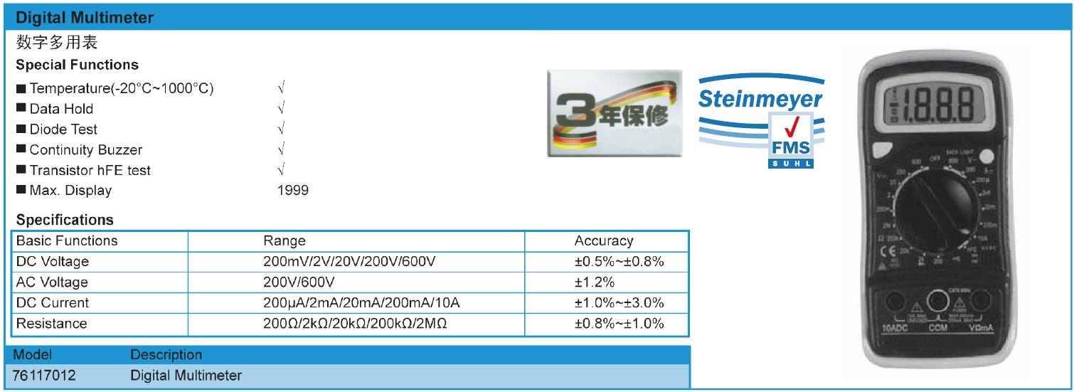 ·温度(-20°C〜1000°c)√ ·数据保持√ ·二极管测试√ ·连续性蜂鸣器√ ·晶体管hFE测试√ ·最大显示1999年 ·直流电压:200mvr2v/2oV/2oov/6oov,土0.5%〜士0.8% ·交流电压200V/6oov,1.2% ·直流电流200uA12mA20mAr200m10A,士1.0%〜士3.0% ·抵抗性200Q/2kQ/20kQ/20OkQ/2Mor,0.8%〜士1.0%