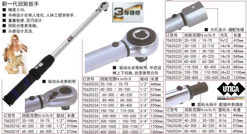 ·精度±3%, ·手柄设计非常人性化,人体工程学把手, ·重量轻便,灵巧设计 ·扭矩分度更准确, ·头部设计灵活