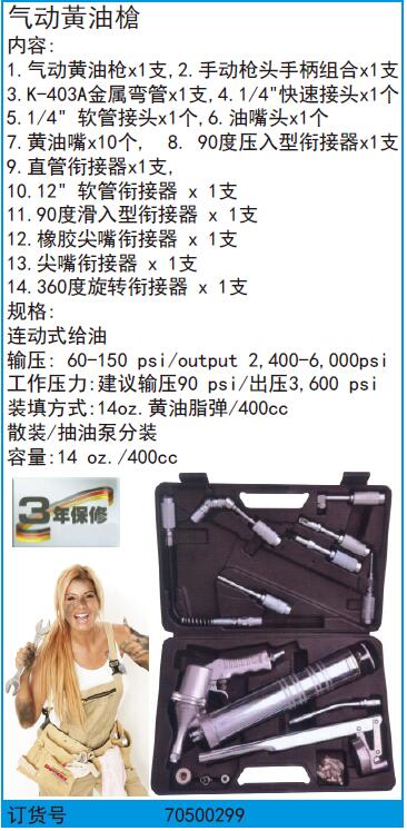 ·内容: ·气动黄油枪x1支, ·手动枪头手柄组合x1支 ·K-403A金属弯管x1支,4.1/4"快速接头x1个 ·1/4"软管接头x1个,6.油嘴头x1个 ·黄油嘴x10个,8.90度压入型衔接器x1支 ·直管衔接器x1支, ·12"软管衔接器x1支 ·90度滑入型衔接器x1支 ·橡胶尖嘴衔接器x1支 ·尖嘴衔接器x1支 ·360度旋转衔接器x1支 ·规格: ·连动式给油 ·输压:60-150psi/output2,400-6,000psi ·工作压力:建议输压90psi/出压3,600psi ·装填