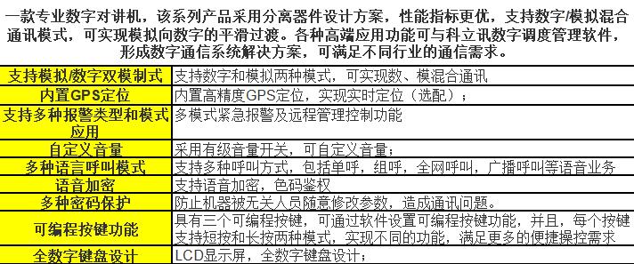·优异可靠的性能指标;直通双时隙技术;高精度GPS定位(选配);IP66防护等级;漫游功能;炫彩面板随心定制(DP585)语音加密,色码鉴权;内置高精度GPS定位模块,配合调度系统;可实现实时追踪定位;可选配蓝牙,倒放,漫游,虚拟集群等高端应用功能;采用有级音量开关,可自定义音量;数/模两种通讯模式,并支持数模混合通讯;支持可编程按键; 多模式紧急报警及远程管理控制功能