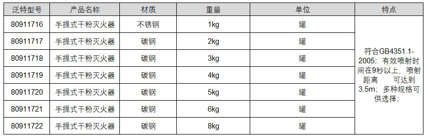 ·符合GB4351.1-2005;有效喷射时间在9秒以上,喷射距离最低可达到3.5m;多种规格可供选择;