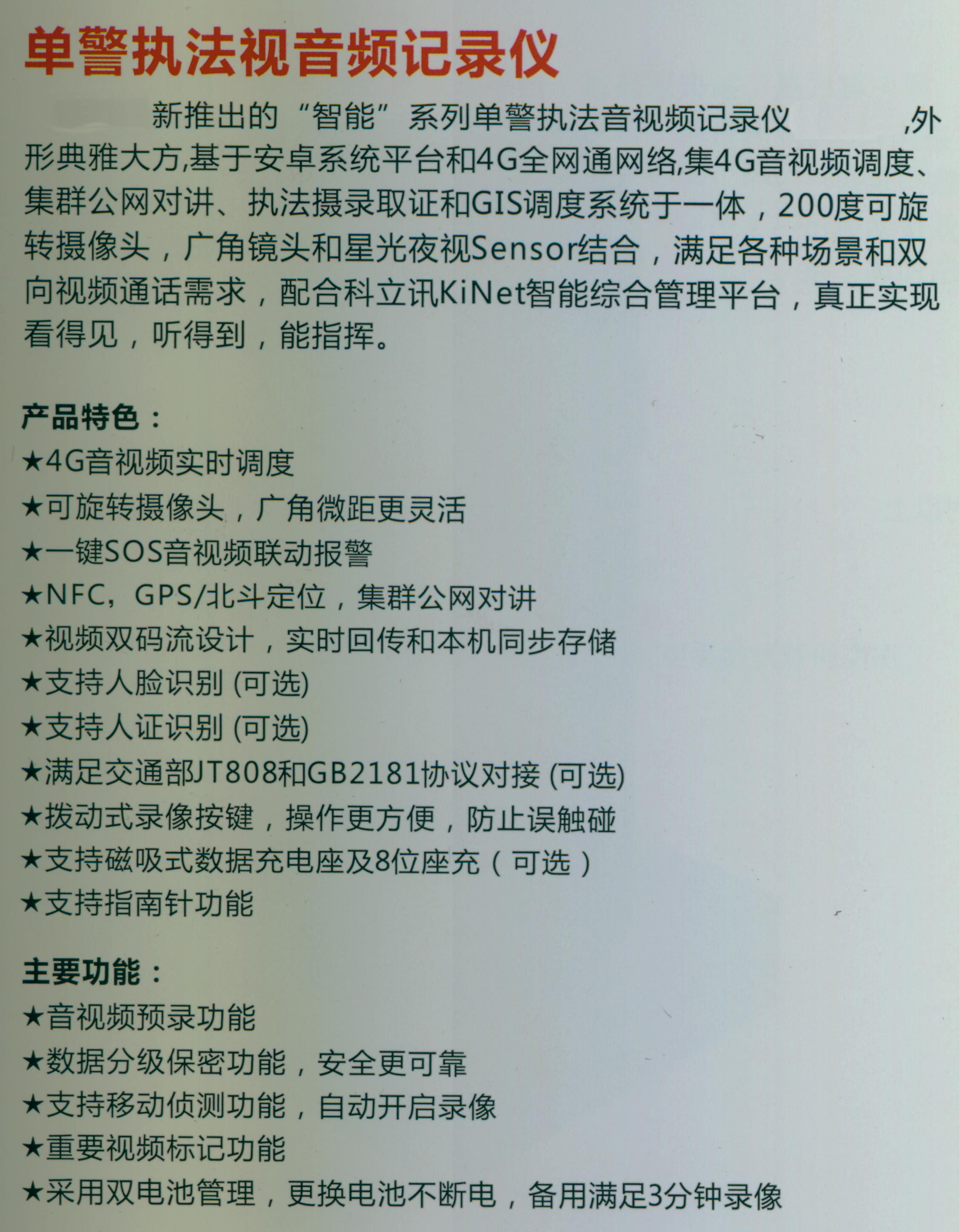 ·4G音视频实时调度; ·可旋转摄像头,广角微距更灵活; ·一键SOS音视频联动报警;NFC,GPS/北斗定位,集群公网对讲; ·视频双码流设计,实时回传和本机同步存储; ·支持人脸识别(可选);支持人证识别(可选); ·满足交通部JT808和GB2181协议对接(可选); ·拨动式录像按键,操作更方便,防止误触碰; ·支持磁吸式数据充电座及8位座充(可选); ·支持指南针功能