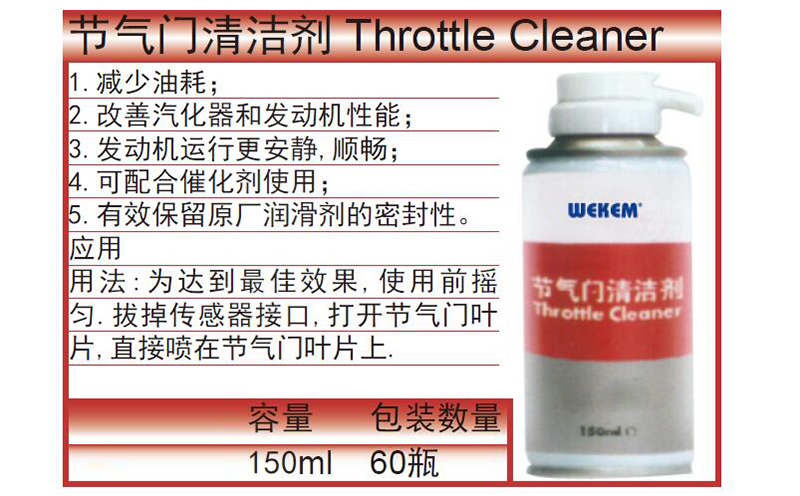 ·减少油耗; ·改善汽化器和发动机性能; ·发动机运行更安静,顺畅; ·可配合催化剂使用; ·有效保留原厂润滑剂的密封性。 ·应用用法:为达到最佳效果,使用前摇匀.拔掉传感器接口,打开节气门叶片,直接喷在节气门叶片上.